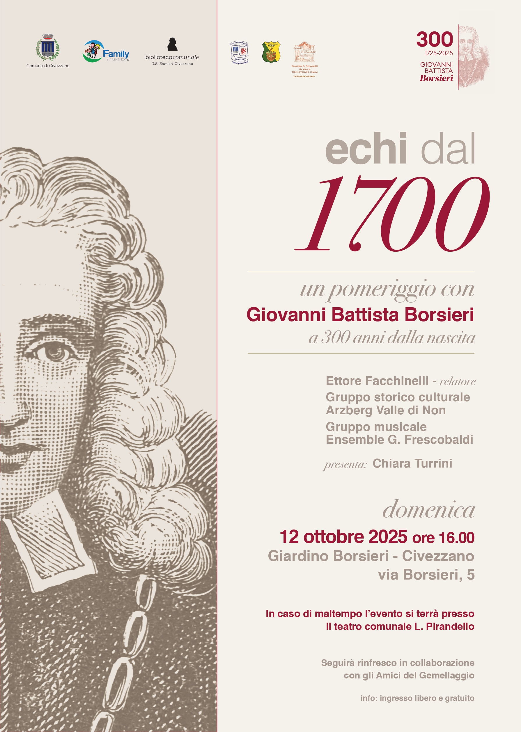 Per celebrare il trecentesimo anniversario della nascita del medico Giovanni Battista Borsieri de Kanilfeld, il Comune, tramite l’Assessorato alla cultura e la biblioteca, ha deciso di organizzare un evento pomeridiano intitolato “Echi dal 1700; un pomeriggio con Giovanni Battista Borsieri a 300 anni dalla nascita”.