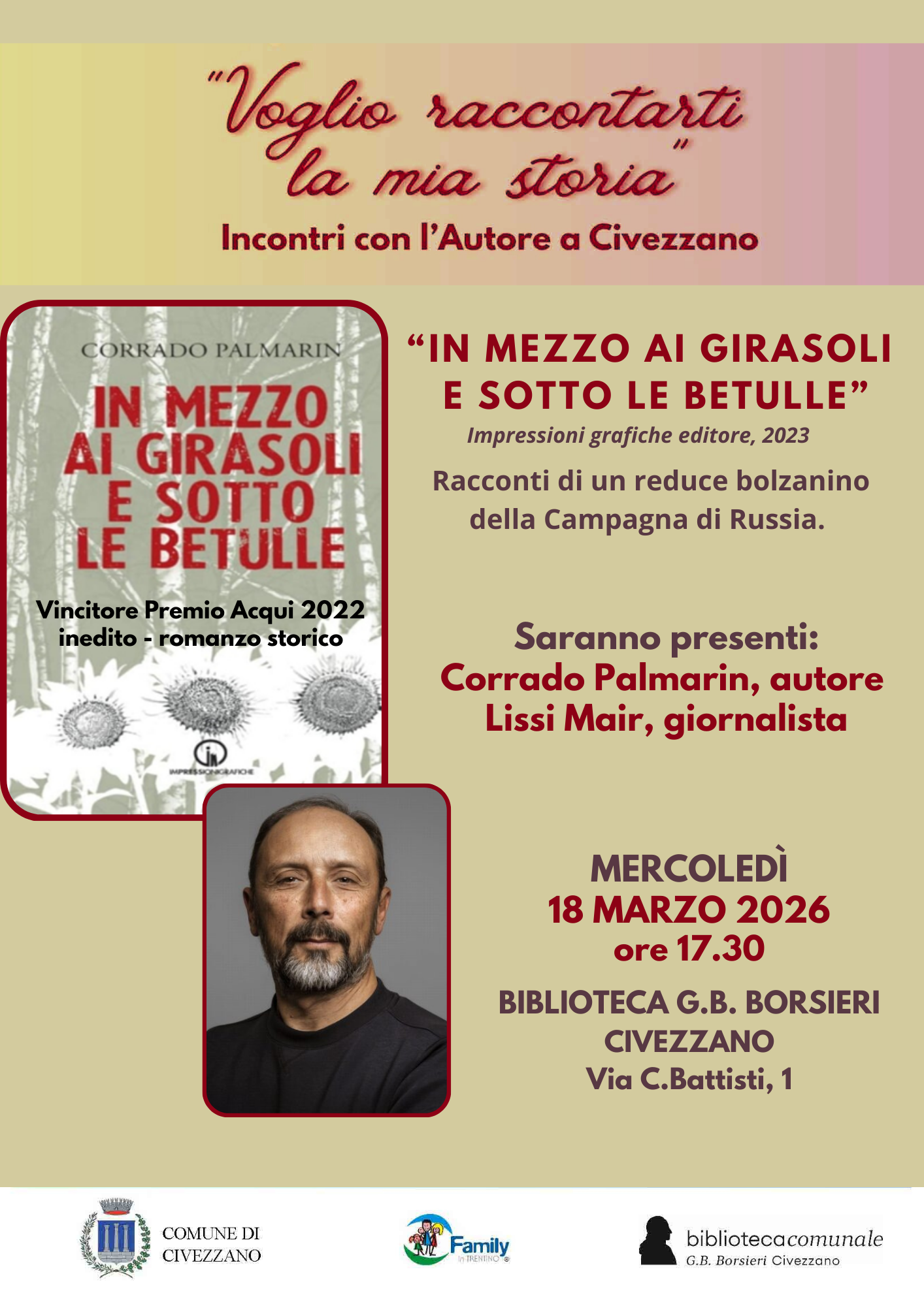 Nell'ambito della Rassegna Letteraria della stagione 2025-2026 mercoledì 18 marzo 2026 ad ore 17:30 presso la Biblioteca G.B Borsieri di Civezzano si terrà l'incontro con Corrado Palmarin, autore del romanzo storico "In mezzo ai girasoli e sotto le betulle"- racconti di un reduce bolzanino della Campagna di Russia.