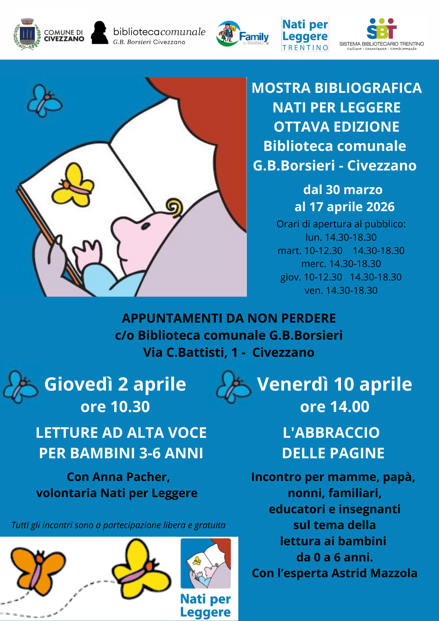 Venerdì 10 aprile 2026 ad ore 14:00 si terrà l'incontro "L'abbraccio delle pagine" presso la Biblioteca comunale G. B. Borsieri di Civezzano.