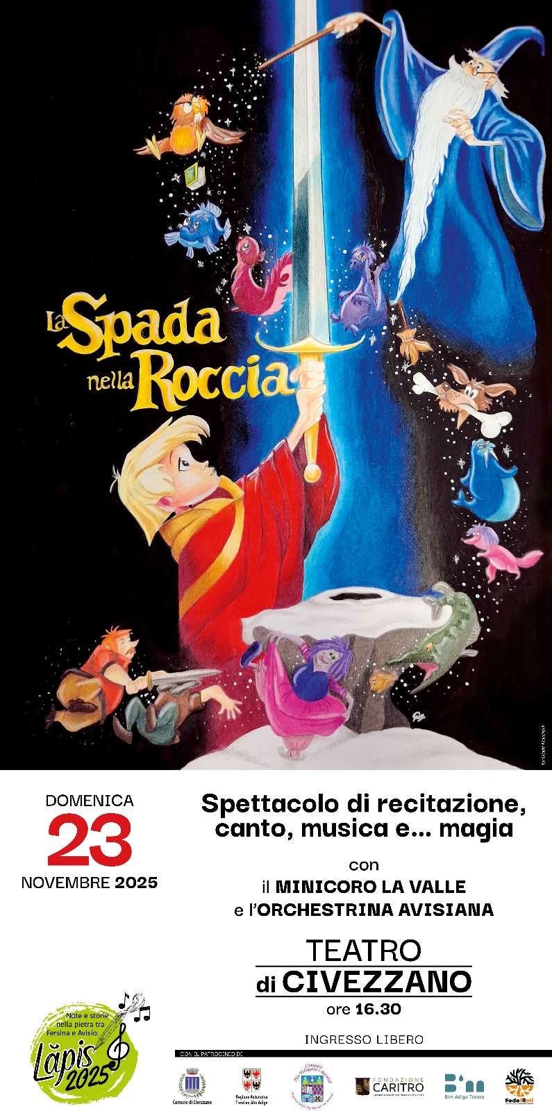 Il testo dello spettacolo è tratto dal famoso film Disney “La Spada nella roccia”, rielaborato da Roberto Bazzanella e che vede protagonisti i componenti del Minicoro La Valle e dell’Orchestrina Avisiana, una decina di diverse scene dove verrà raccontata la leggenda di Re Artù che, cresciuto povero, si trova, per destino, a diventare Re d’Inghilterra.