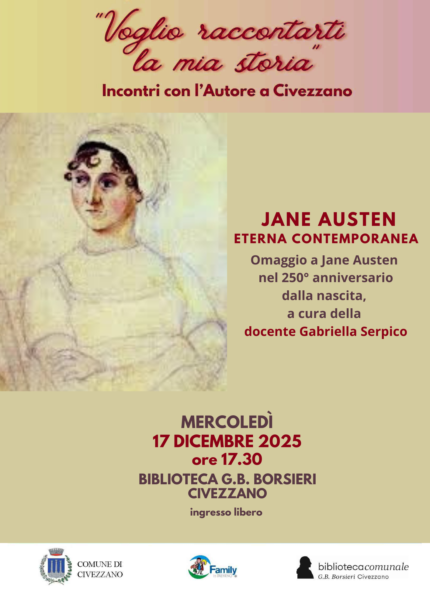 L'evento avrà luogo presso la Biblioteca Comunale "G.B. Borsieri" di Civezzano il giorno 17.12.2025 ad ore 17.30.